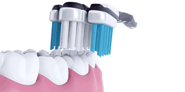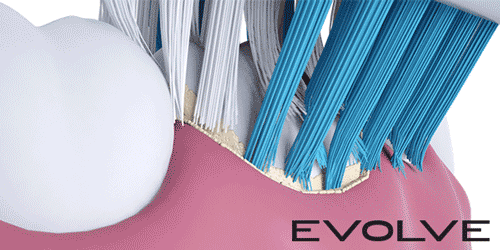 EVOLVE's three bristle heads are embedded in an elastic membrane. With gentle pressure to the center head, outer bristles flex inward and grab your tooth at the gum line, allowing you to clean multiple surfaces of your teeth and gums simultaneously.